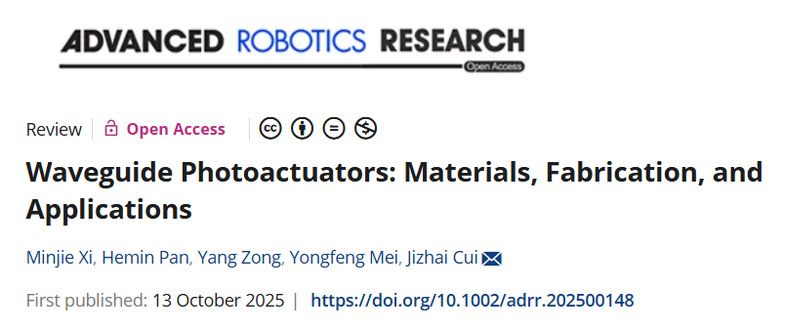 对于光波导致动器领域的研究现状,我院崔继斋青年研究员课题组近日受邀在《Advanced Robotics Research》上发表了题为《Waveguide Photoactuators: Materials, Fabrication, and Applications》的综述论文。