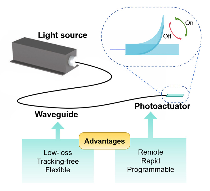 光波导致动器是一种通过光波导(如光纤或平面波导)将光能引导至光响应材料,从而将光能转化为精确机械运动的装置。相比热、电、磁、化学、湿度等驱动方式,光驱动的优势在于传输速度快、无需复杂线路,且其波长、强度和偏振的可调性提供了高精度的空间寻址能力和时序开关控制,易于实现可编程运动。目前大多数光致动器依赖自由空间照明,但这种方式存在能量转换效率低、需要主动光束追踪的局限性。将光路嵌入波导内部提供了一种解决方案:光波导通过全反射低损耗地传输光子,使能量传输与致动器自身运动及周围环境解耦。因此,光波导致动器兼顾了光照的精确性与操作的灵活性,在软体机器人、生物医学工具以及在非透明或密闭环境中工作的可重构设备中具有广阔应用前景。