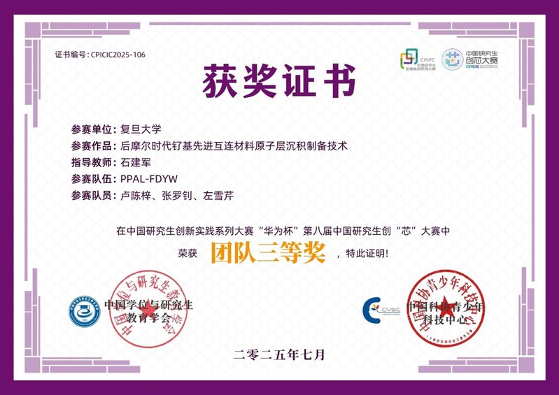 Our institute delivered an outstanding performance at this year's competition. The Gaoshan Innovation Team, led by Yi Wang with members Xinyi Ke, and Yu Mei under the guidance of Professor Gaoshan Huang, secured a Third Prize for their robust research on Multi-Modal Metal-Organic Framework (MOF) Film-Based Sensors with Neural Network Assistance. They successfully advanced to the national offline finals, competing with 188 elite teams for top honors through a high-intensity assessment including a rigorous 7 hours closed-room computer-based examand written tests. The PPAL-FDYW team, led by Chenzi Lu with members Xueqin Zuo and Luozhao Zhang, focused on Atomic Layer Deposition (ALD) technology for ruthenium (Ru)-based interconnect materials targeting post-Moore-era challenges. Under the guidance of Professor Jianjun Shi, their innovative solution secured the Third Prize.