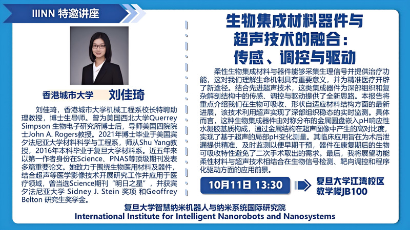 柔性生物集成材料与器件能够采集生理信号并提供治疗功能,这对我们理解生命机制具有重要意义,并为精准医疗开辟了新途径。结合先进超声技术,这类集成器件为深部组织和复杂解剖结构中的传感、调控与驱动提供了全新思路。本报告将重点介绍我们在生物可吸收、形状自适应材料结构方面的最新进展,该技术利用超声实现了深部组织稳态的实时监测。具体而言,这种生物集成器件由对称分布的金属圆盘嵌入pH响应性水凝胶基质构成,通过金属结构在超声图像中产生的高对比度,实现了基于超声的局部pH变化测量。其临床应用旨在为术后泄漏提供精准、及时监测以便早期干预,器件在康复期后的生物可吸收特性避免了二次手术取出的需求。最后,我将展望功能柔性材料与超声技术相结合在生物信号检测、靶向调控和程序化驱动方面的应用前景。