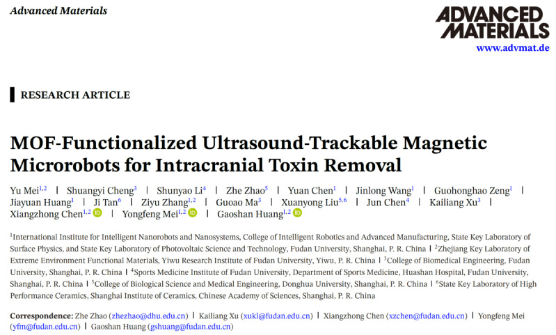 文章信息:Yu Mei#, Shuangyi Cheng#, Shunyao Li, Zhe Zhao*, Yuan Chen, Jinlong Wang, Guohonghao Zeng, Jiayuan Huang, Ji Tan, Ziyu Zhang, Guoao Ma, Xuanyong Liu, Jun Chen, Kailiang Xu*, Xiangzhong Chen*, Yongfeng Mei*, Gaoshan Huang*, MOF-Functionalized Ultrasound-Trackable Magnetic Microrobots for Intracranial Toxin Removal, Adv. Mater. 2025: e16357.