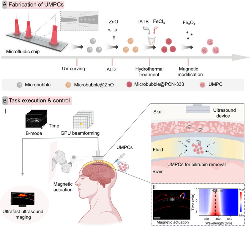 微机器人由三层核心功能结构组成:内部为含有气芯结构的水凝胶微泡,可显著增强超声成像对比度,为实时超声追踪提供支撑;外层利用原子层沉积技术诱导生长有机金属框架(PCN-333)层,凭借多孔骨架结构提供的丰富位点和配体与胆红素分子之间相互作用,具备极强的胆红素吸附能力,可实现主动高效的胆红素捕获;表层修饰磁性氧化铁纳米颗粒,赋予微机器人磁响应运动能力,可在外部磁场引导下精准穿梭于复杂生理环境。微机器人系统整合了超声实时追踪功能,能够精准定位微机器人在体内的运动位置,实现“导航 - 吸附 - 监测” 多功能集成及闭环治疗。团队通过体外胆红素吸附实验与兔颅内活体实验,充分验证了该技术的有效性。此外,该微机器人的设计理念还可延伸至关节腔、膀胱等封闭生理环境的其他毒素清除,为多种毒性代谢物相关疾病的治疗提供了通用型解决方案。未来,该技术有望为急性胆红素脑病等疾病患者带来更安全、更有效的治疗选择,推动以微型机器人为平台的靶向解毒疗法进入精准化、微创化的新时代。