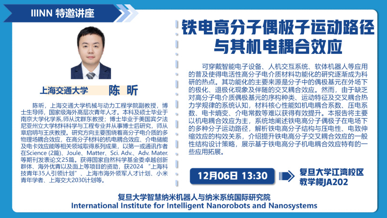 陈昕,上海交通大学机械与动力工程学院副教授,博士生导师,国家级海外高层次青年人才。本科及硕士毕业于南京大学化学系,师从沈群东教授;博士毕业于美国宾夕法尼亚州立大学材料科学与工程专业并从事博士后研究,师从章启明与王庆教授。研究方向主要围绕着高分子电介质的多物理场耦合效应,在高分子材料的机电耦合效应、介电储能及电卡效应能等相关领域取得系列成果,以第一或通讯作者在Science (2篇)、Joule、Matter、Sci. Adv.、Adv. Mater.等期刊发表论文25篇。获得国家自然科学基金委卓越创新群体、海外优青以及面上等项目的资助,获2024 “上海科技青年35人引领计划”、上海市海外领军人才计划、小米青年学者、上海交大2030计划等。