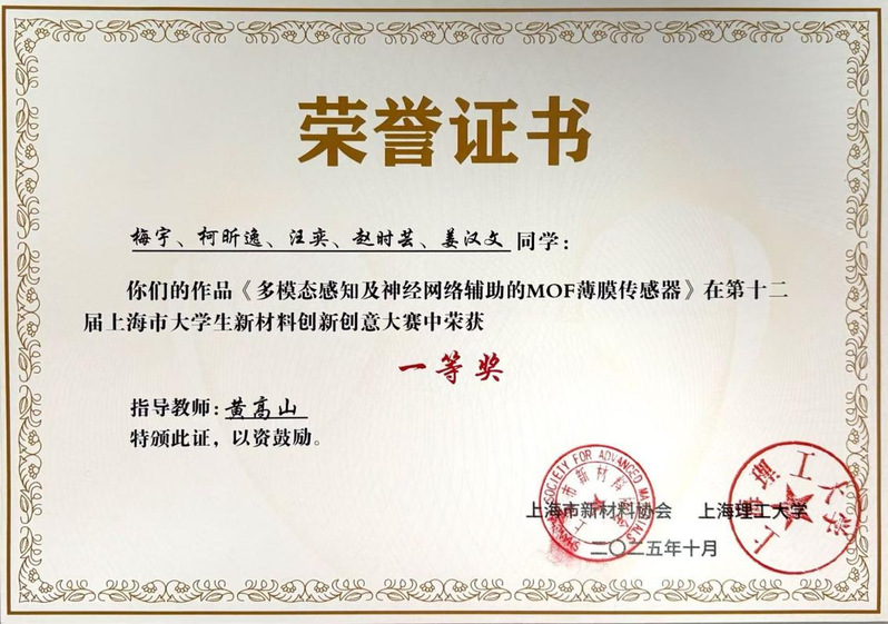由复旦大学智慧纳米机器人与纳米系统国际研究院(IIINN)研究生梅宇、柯昕逸、汪奕、赵时芸、姜汉文组成的团队,在黄高山教授的指导下,凭借面向前沿尖端应用的作品“多模态感知及神经网络辅助的MOF薄膜基传感器”,历经初赛评选、路演展示、决赛答辩等环节的激烈角逐,从300余支参赛队伍中脱颖而出,最终荣获大赛一等奖。该作品立足于健康监测的前沿需求,采用原子层沉积(ALD)技术实现了微纳尺度MOF薄膜的可控组装及多模态传感器的制备,并采用人工智能神经网络精准识别复杂传感信号。