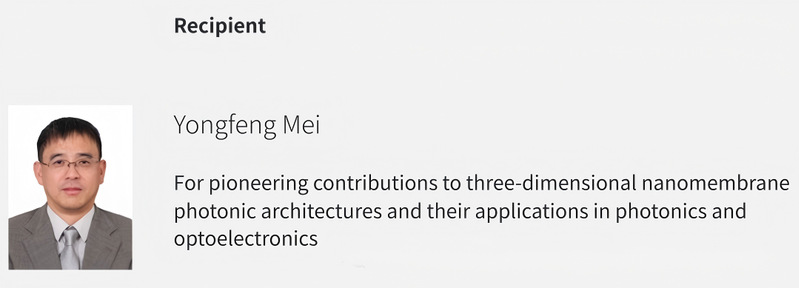Optica (formerly OSA) has announced the 2026 class of Optica Fellows, honoring 121 scientists worldwide for their significant contributions to optics and photonics. Prof. Yongfeng Mei, Executive Dean of the International Research Institute for Intelligent Nanorobotics and Nanosystems at Fudan University, has been elected an Optica Fellow.