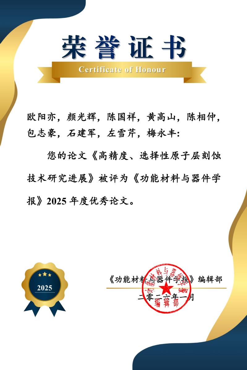 在近期公布的《功能材料与器件学报》2025年度表彰名单中,我院执行院长梅永丰教授被评为“年度优秀编委”,其论文《高精度、选择性原子层刻蚀技术研究进展》入选“年度优秀论文”。两项荣誉既是对梅永丰教授学术贡献的认可,也是对他编审工作的肯定。