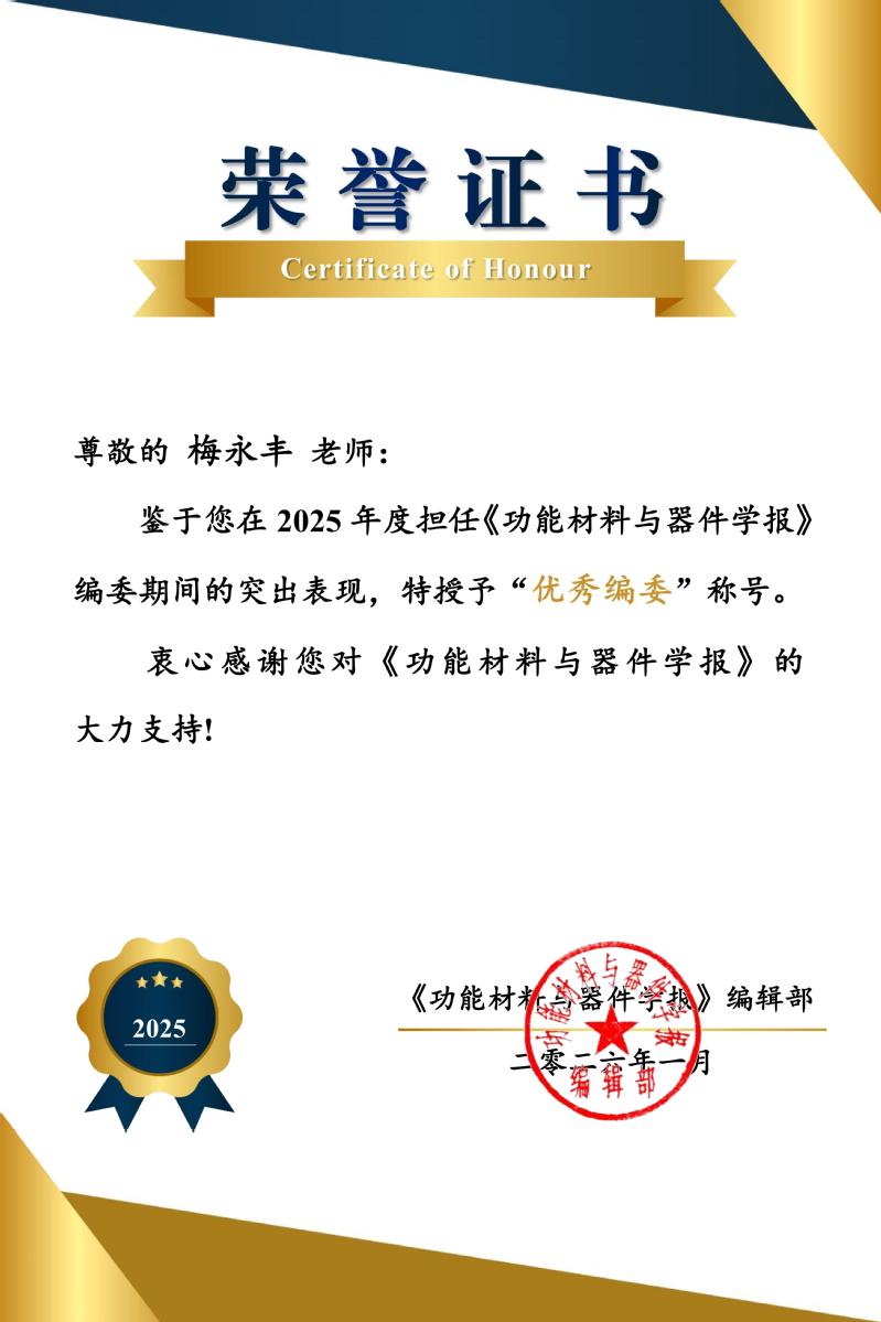 在近期公布的《功能材料与器件学报》2025年度表彰名单中,我院执行院长梅永丰教授被评为“年度优秀编委”,其论文《高精度、选择性原子层刻蚀技术研究进展》入选“年度优秀论文”。两项荣誉既是对梅永丰教授学术贡献的认可,也是对他编审工作的肯定。