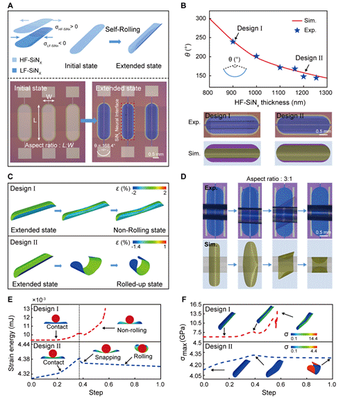 该神经界面由具有内应力梯度的SiNx 双层薄膜构成,在释放约束后可由平面结构自发卷绕形成三维管状结构。器件在展开与卷绕状态之间呈现明显的双稳态特征,使其在植入过程中保持平面、在目标区域实现自适应包覆。该设计有效避免了传统缝合或外力固定方式对神经组织造成的二次损伤。