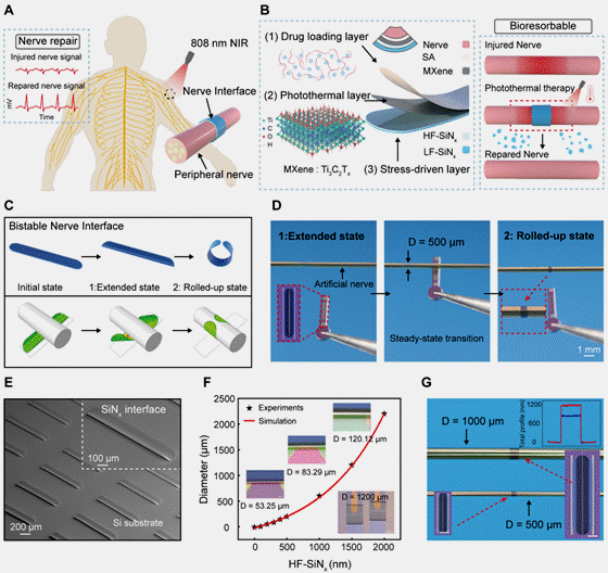 针对上述挑战,复旦大学智能机器人与先进制造创新学院/智慧纳米机器人与纳米系统国际研究院的梅永丰/宋恩名研究团队报道了一种自卷绕、生物可吸收的双稳态神经接口(self-wrapping bistable, SWB neural interface),用于局灶性外周神经损伤的无线多模态治疗。该器件基于应力梯度驱动的超薄 SiNx 双层结构,在触发后可由平面状态自发转变为三维卷绕结构,从而对不同直径的外周神经实现温和而稳定的包覆。在功能集成方面,该神经接口引入MXene 光热层与药物负载模块,构建了无线近红外触发的光热治疗与药物释放相结合的多模态治疗体系,实现了对神经修复过程的时空精准调控。通过系统的力学建模、有限元仿真及在体实验,研究团队验证了器件自卷绕双稳态转变的可靠性、生物可吸收特性及其在大鼠坐骨神经损伤模型中的治疗效果。相关成果以 “A self-wrapping, bioresorbable neural interface for wireless multimodal therapy of localized peripheral nerve injury” 为题发表于 Proceedings of the National Academy of Sciences of the United States of America(PNAS)。