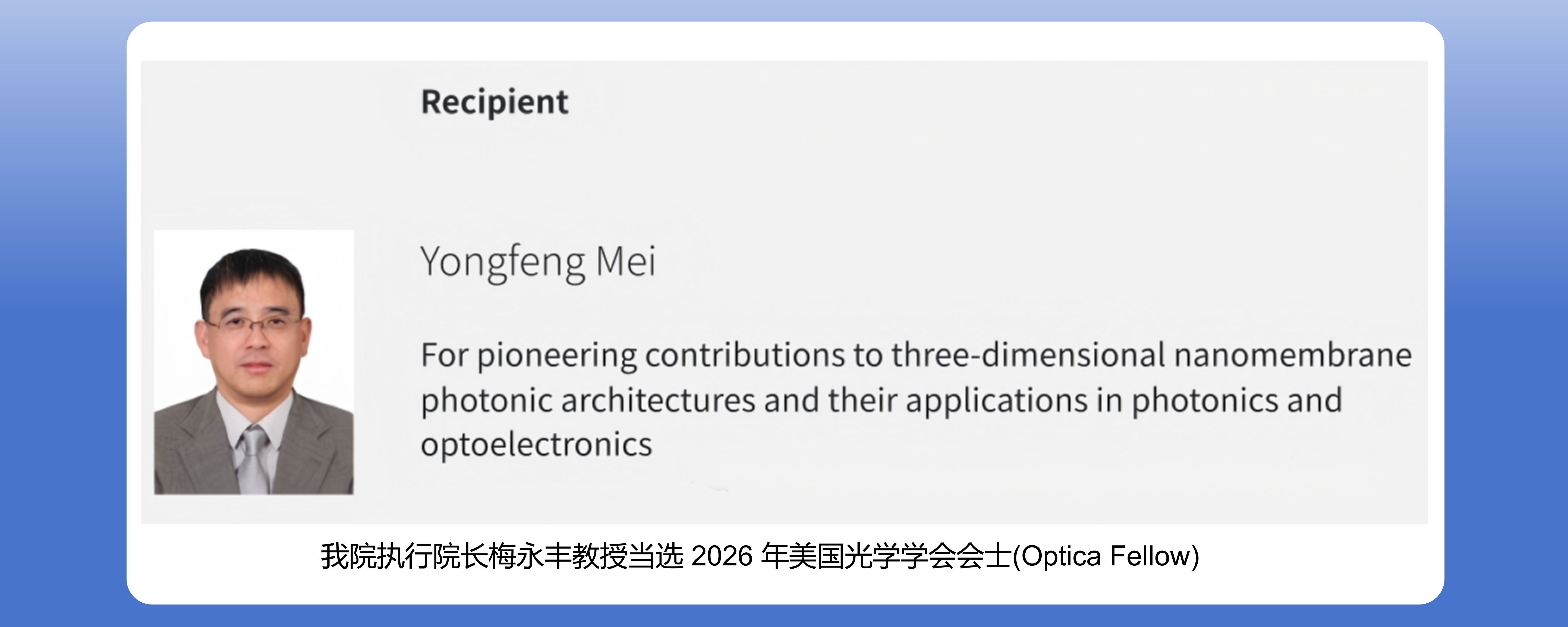 近日,美国光学学会(Optica)公布了 2026 年度会士(Fellow)名单,从全球范围内遴选出 121 位在光学与光子学领域取得突出成就的科学家授予该荣誉。复旦大学智慧纳米机器人与纳米系统国际研究院执行院长梅永丰教授...