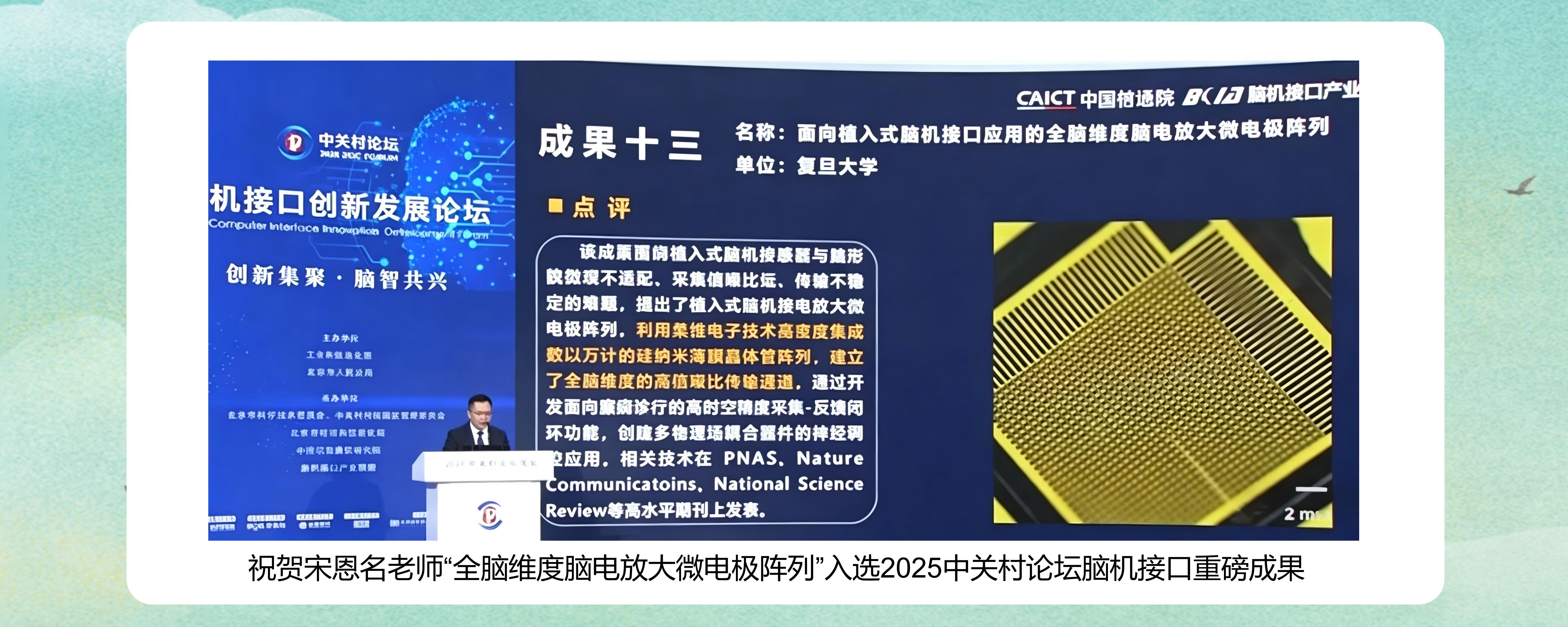 近日,在中关村论坛“脑机接口创新发展论坛”上,脑机接口产业联盟与中国信通院联合发布了十五项脑机接口领域重磅成果。其中,宋恩名老师团队研制的“面向植入式脑机接口应用的全脑维度脑电放大微电极阵列”成功入选...